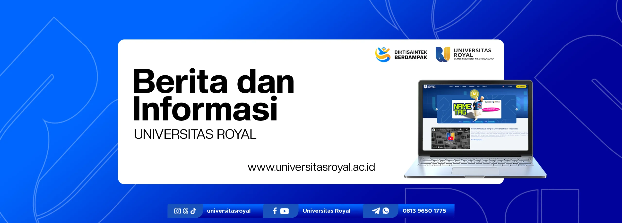 Universitas Royal – Hai, #SahabatRoyal, Universitas Royal kembali menyapa para mahasiswa baru melalui kegiatan PKKMB (Pengenalan Kehidupan Kampus bagi Mahasiswa Baru) Tahun 2024. Sebagai bagian dari rangkaian kegiatan, nametag peserta PKKMB Universitas Royal 2024 kini sudah dapat diakses secara online. Setiap mahasiswa baru diwajibkan menggunakan twibbon nametag sesuai program studi masing-masing. Perlu diperhatikan bahwa setiap […]